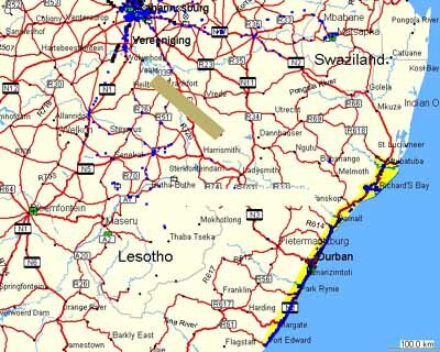 Map above shows the combination of our 2 recent forays highlighted in yellow. The situation is actually better than shown here since Trevor has also busted the road down from Jo'burg around Swaziland, so that in fact the two yellow areas could almost be connected.